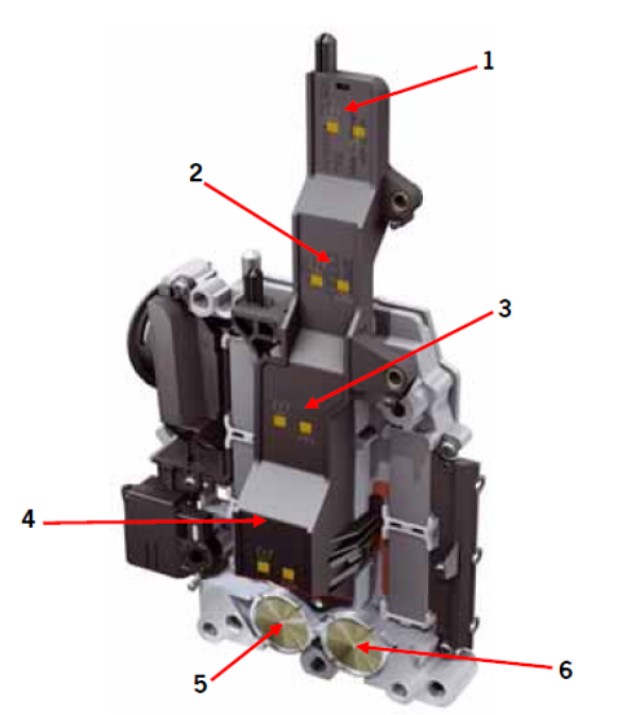 Датчик передачи и датчики числа оборотов входного вала коробки передач 1 и 2 (см. рисунок «Блок управления коробки передач (устройство управления и золотниковый блок)», положение 2-4) расположены на модуле датчика. Модуль датчика соединен с устройством управления в блоке управления с помощью жгута проводов и штекерного соединения, и может быть заменен индивидуально. После этого требуется калибровка модуля датчика (датчика передачи).