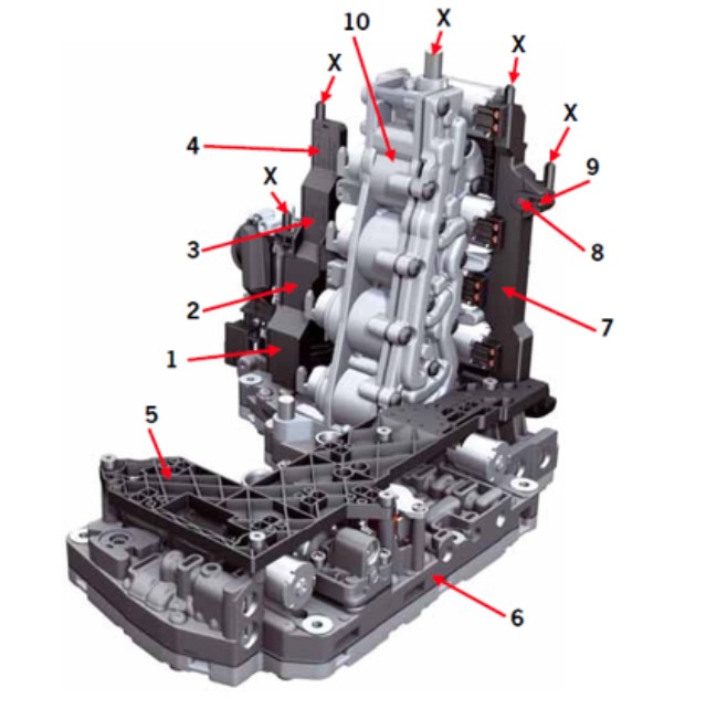 Блок управления коробки передач (также — «гидравлическое устройство переключения (HSG)», «мехатроник» или «золотниковый блок») состоит из устройства управления электроники коробки передач (PDK), золотникового блока (исполнительных элементов) и части датчиков: