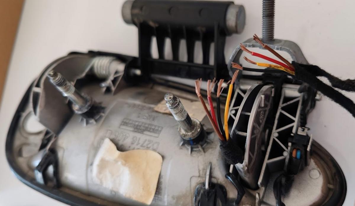 Если у вас перестали работать датчики приближения на ручках или запирание с кнопок и появились ошибки - 880A09, 880B09, 880C09, 880D09, то ручку нужно демонтировать и произвести ремонт проводки ручки посредством спайки этих четырёх повреждённых и отгнивших проводов на фото. Функционал ручки должен полностью восстановиться и ошибки уйти - даже стирать не надо :)