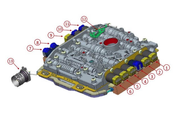 7 Электромагнитный клапан 2 (переключает давление масла на мультиплексорный клапан 2)