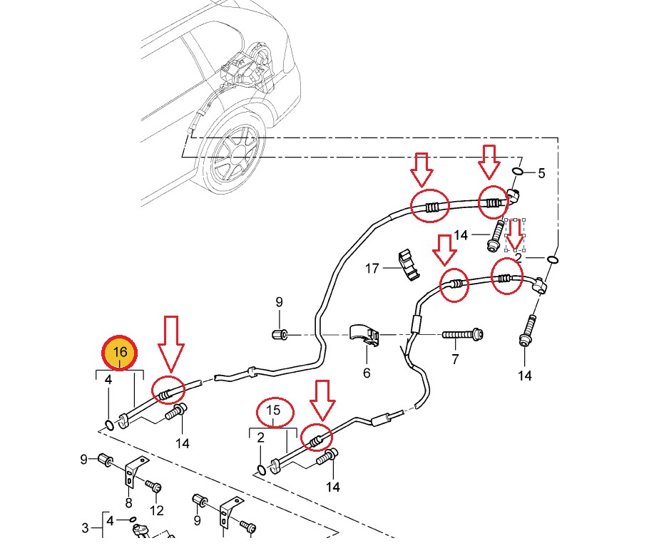 В частности, многие диагносты забывают проверить на герметичность трубопроводы под подкрылком заднего левого колеса - смотрите схему во вложении - трубопровод 15 и 16. Места, наиболее подверженные коррозии, отмечены стрелкой.