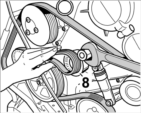 8. Сложить часть ремня между направляющим роликом ряда цилиндров 1-4 и ременным шкивом коленчатого вала в петлю и провести его вверх к натяжному ролику. Провернуть натяжитель ремня за шестигранник по часовой стрелке с помощью накидного ключа (размером 30) и уложить приводной ремень. Медленно разгрузить натяжной ролик.