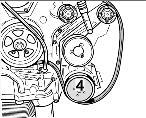 5. Затем установить нижнюю часть ремня на шкив компрессора кондиционера -4- .