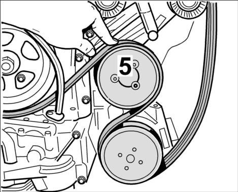 6. Затем установить петлю ремня на насос гидроусилителя -5- .