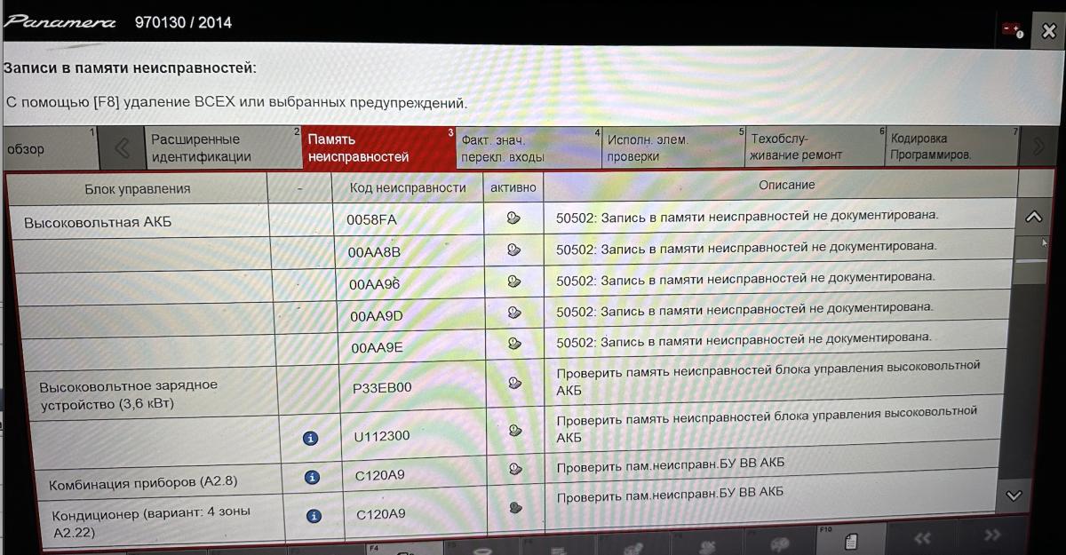 Panamera S E-hybrid, 2014. После длительной стоянки из-за морозов была попытка завести авто, изначально никаких ошибок не было, при попытке завести ощущались попытки провернуть двигатель, но чуда не произошло, судя по "вялости" видимо был подсажен 12В аккумулятор. На следующий день его сняли, зарядили и поставили назад. Теперь на приборной панели изображение автомобиля красного цвета с восклицательным знаком и надписью Hybrid со странным сообщением "Парковать надежно". Стоит колом, двигатель даже не пытается заводить, и через равные промежутки времени слышны щелчки какого то исполнительного механизма в районе зарядного разъема, по аналогии чем-то похожее на попытки закрыть ЦЗ при открытой двери. По ошибкам висит все так или иначе связанное с ВВ АКБ без каких либо деталей (0058FA, 00AA8B, 00A96, 00AA9D, 00AA9E, P33EB00, U112300, C120A9).