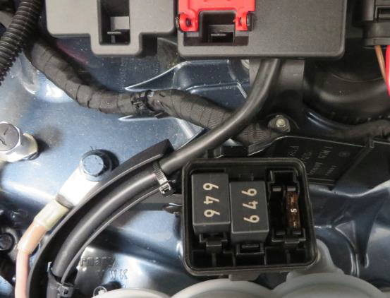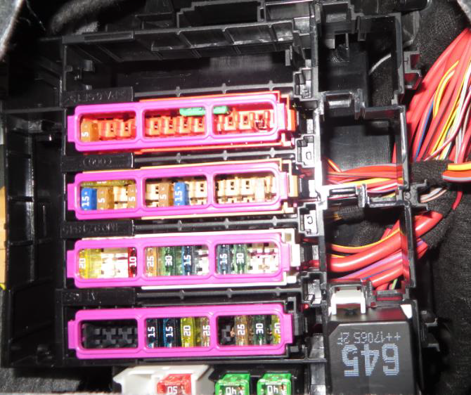 Рис. 5. В пространстве для ног слева по направлению движения рядом с педальным узлом под опорной для ног расположен блок предохранителей и реле для салона автомобиля. Он содержит 5-рядные отдельные блоки A-F и ряд предохранителей Maxifuses вместе с реле с замыкающим контактом. Maxisfuse и реле отвечают заходовую часть и DME. Чтобы получить доступ к этому блоку предохранителей и реле в автомобиле с левым рулем, необходимо выкрутить сверху на опоре для ног винт с головкой Torx.