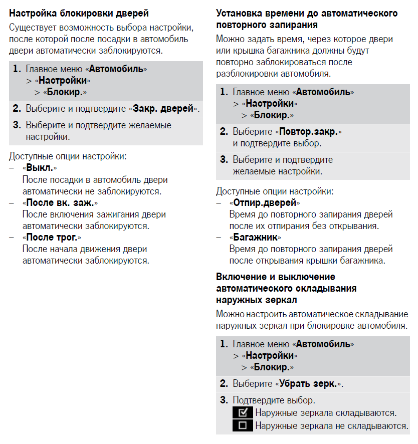 Для получения информации о введенных на многофункциональном дисплее настройках для блокировки и разблокировки: