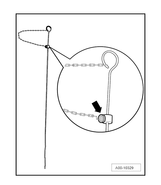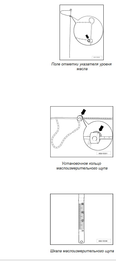 Задвинуть прибор для проверки указателя уровня масла до упора (установочное кольцо) в трубку для маслоизмерительного щупа, затем снова вынуть его и считать уровень масла.