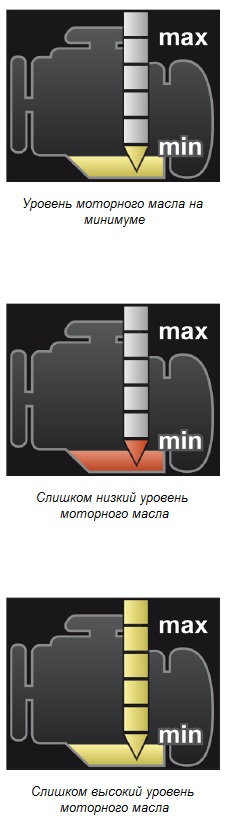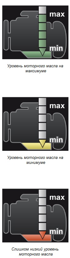 При уровне моторного масла на минимуме → Уровень моторного масла на минимуме нижний сегмент имеет желтый цвет.