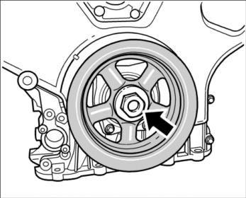 1. Насадить ременный диск втулку на торец коленвала. Затем слегка нажать на ременный шкив по направлению к двигателю, одновременно поворачивая его до тех пор, пока он не начнет скользить по направлению к крышке кожуха привода ГРМ. При этом следить за призматической шпонкой.