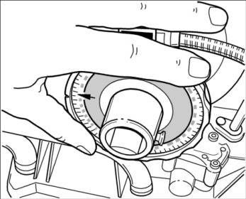 5. Установить индикатор угла затяжки Механический индикатор угла затяжки для затяжки на определенный угол Nr.88-1. Установить магнитную ножку на металлический элемент и поворотом сбросить шкалу на 0. В качестве альтернативы применению индикатора угла затяжки можно нанести водостойким маркером метки на демпфере крутильных колебаний (ременном шкиве коленчатого вала) и центральном винте. Сплошная метка на крепежном винте и демпфере крутильных колебаний используется в качестве исходной точки, еще одна метка только на демпфере крутильных колебаний, нанесенная под углом 90° к первой метке, является конечной точкой затяжки.