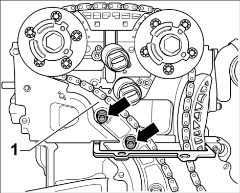 4. Снять цепь ГРМ между промежуточным валом и распредвалами. Для этого демонтировать черную направляющую планку -1- , открутив 2 крепежных винта M8 x 43 -стрелки- , и положить цепь ГРМ в сторону к распредвалу.