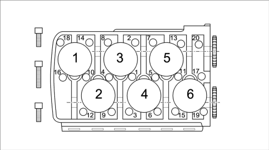 5. Открутить винты крепления ГБЦ в последовательности, обратной указанной, снаружи внутрь -см. рисунок- .