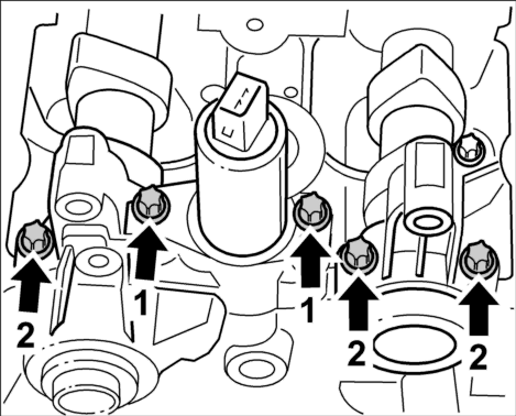 На первой крышке распределительного вала с 2005 модельного года имеются два проходных отверстия для закрепления гидравлического клапана (два винта M6 x 60) -1- . Под гидравлическим клапаном установлен дополнительный сетчатый масляный фильтр.