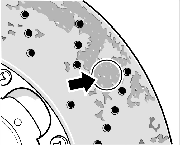 На рабочих поверхностях тормозных дисков имеются пластинки индикации износа. Пластинки индикации износа (по 6 шт. на диск) расположены по внешнему диаметру, в трех точках со смещением на 120° -стрелки- . Все 3 пластинки индикации износа на рабочих поверхностях диска (3 шт. с внутренней стороны и 3 шт. с внешней) расположены точно друг против друга. Размер каждого индикатора составляет ок. 2 см2. Индикаторы на новых тормозных дисках едва видны.
