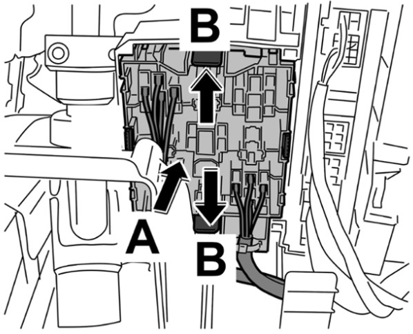 1 Разблокировать левый держатель реле -стрелки A- и вытянуть его вниз -стрелка B-.
