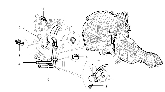 1 - Разъем импульсного датчика коленвала за насосом вторичного воздуха, ряд цилиндров 5–8