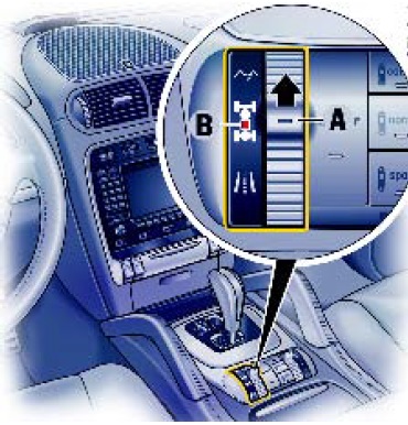 Нажмите переключатель A вперед и держите до тех пор, пока на многофункциональном дисплее панели приборов не отобразится включение программы движения по бездорожью и не загорится светодиод B.