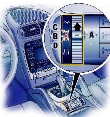 Пошагово перемещайте переключатель A вперед до тех пор, пока подключение блокировки межколесного дифференциала не отобразится на многофункциональном дисплее панели приборов и не загорятся три светодиода B, C и D.