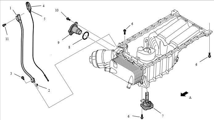 6 - Винт M6 x 25 ; крышка кожуха ГРМ и кожух маслопровода → момент затяжки: 12 Nm ; датчик уровня масла и кожух маслопровода → момент затяжки: 10 Nm ; кожух маслопровода и нижняя часть блока цилиндров → момент затяжки: 13 Nm