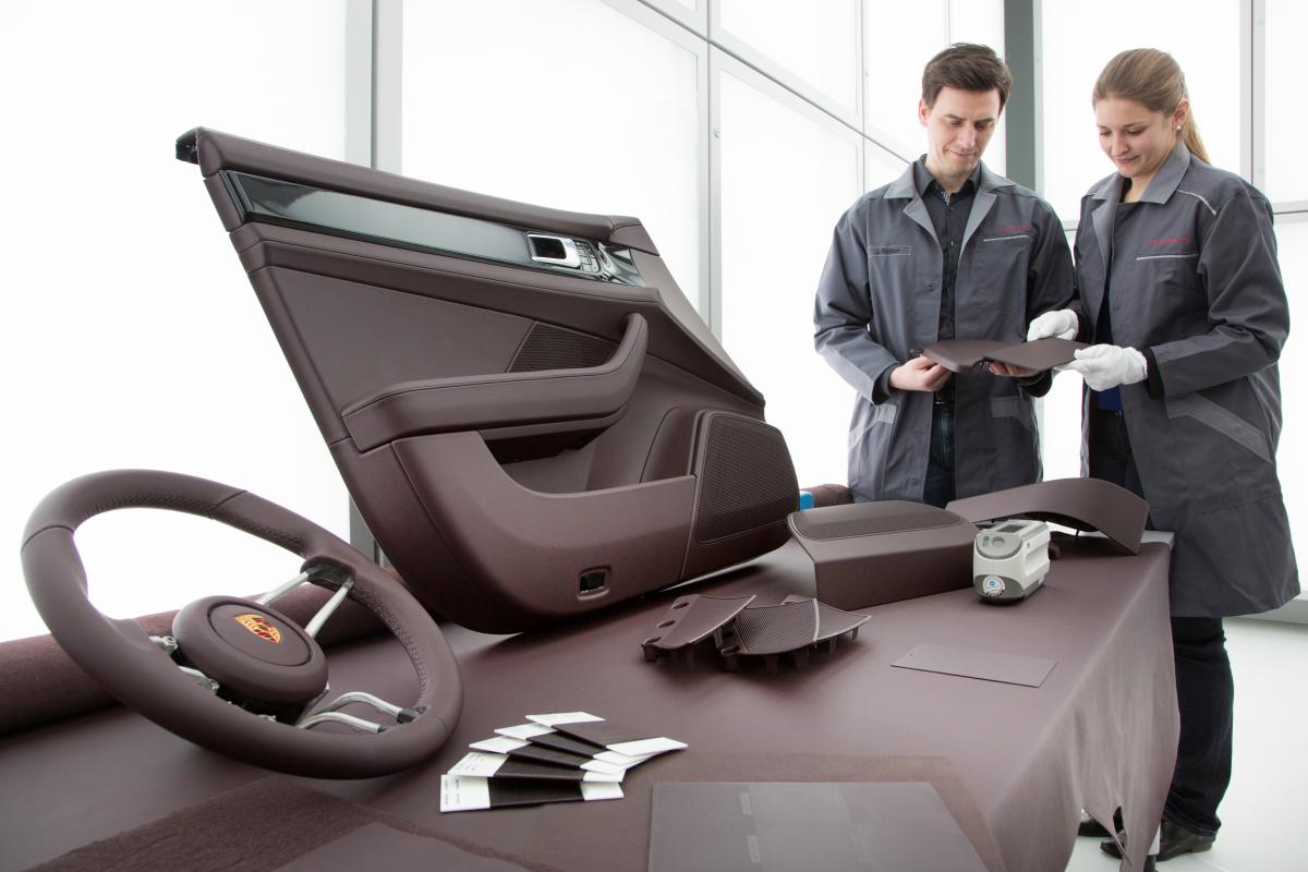 Цвета интерьера определяют дизайнеры компании Porsche. На следующем этапе создается исходный цветовой образец, который используется для оценки кожаных обивок, лаков, пластика, пленок, тканей, ковровых покрытий и нитей. Задача состоит в выборе правильного и гармоничного цветового оттенка. Результат идеален только тогда, когда каждый отдельный компонент оснащения салона образует однородную картину со всеми прочими заметными глазу деталями того же цветового оттенка.