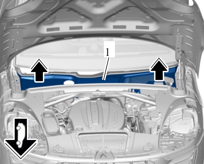 1. Отсоединить накладку -1- водоотводящего короба движением наверх и снять движением вперед.