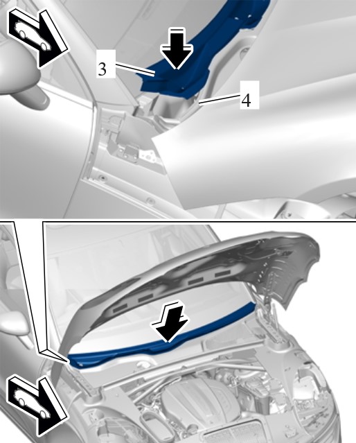 2. Заблокировать фиксатор -3- накладки обтекателя в крепежной планке лобового стекла -4- .