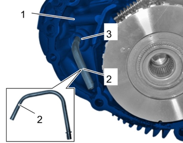 2.1 С помощью VAS 6563 - набора ручных дозирующих насосов Porsche и VAS 6563/4 - переходной трубки-2- откачать оставшееся масло через контрольное и заливное отверстие -3-.