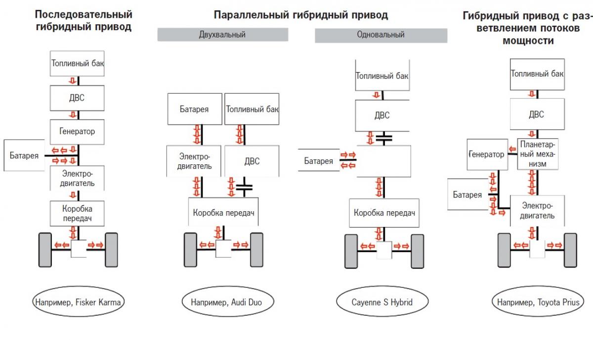 гибриды, а также смешанные формы этих приводов, как например, полные гибриды с разветвлением потоков мощности.
