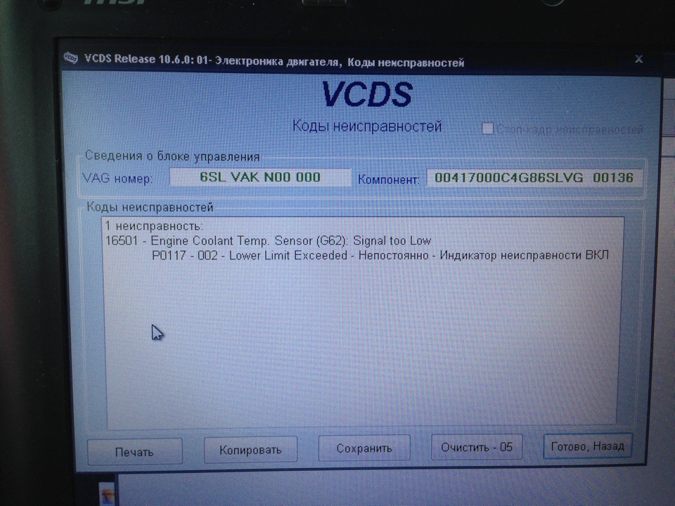 ваг шнурком прочитал : ошибка 16501 engine coolant temp. sensor (g62): signal too low P 0117 - 002 lower limit exceeded- непостоянно - индикатор неисправности ВКЛ