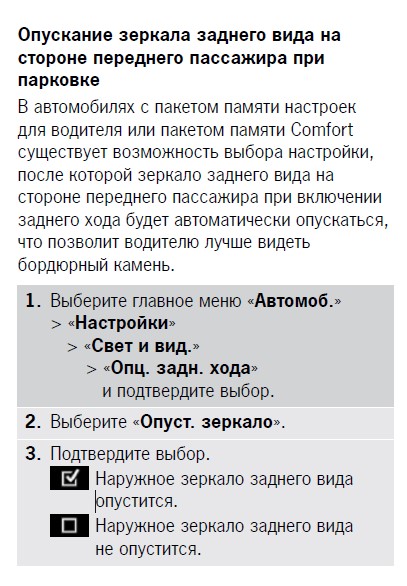 В автомобилях с функцией памяти настроек для водителя или с функцией памяти Comfort стекло зеркала на стороне переднего пассажира при включении задней передачи слегка наклоняется вниз, чтобы обеспечить обзор зоны кромки бордюрного камня.