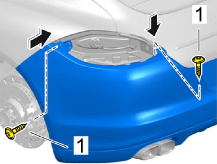 1. Вывернуть винты -1- на облицовке задней части кузова снизу.