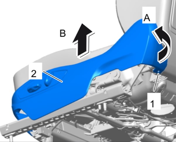3 Потянуть облицовку подушки сиденья с внешней стороны -2- сзади наружу -A- и одновременно отжать ее вверх -B-.