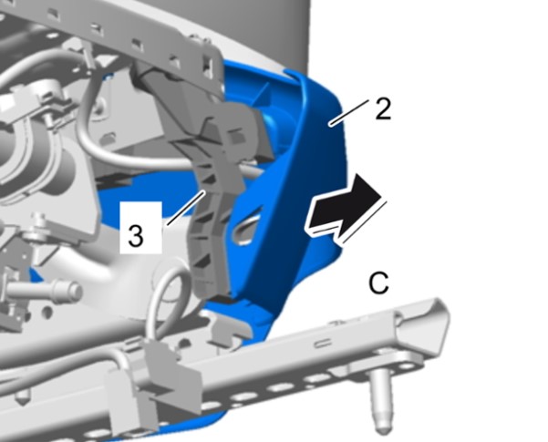 4 Вытянуть облицовку подушки сиденья с внешней стороны -2- из крепления вперед -C-.