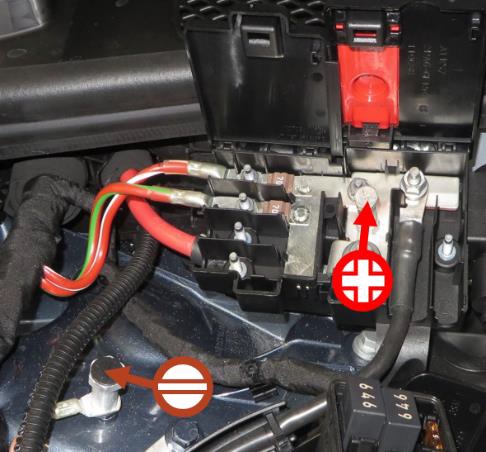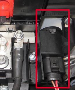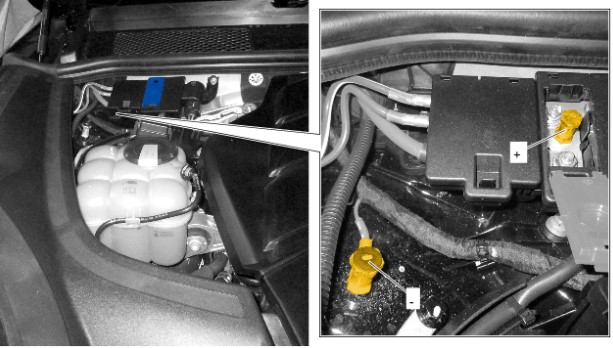 Точка подключения внешнего источника питания находится в моторном отсеке в отдельном блоке спереди справа по направлению движения. Плюсовой штифт по соображениям безопасности снабжен красной крышкой. Для снятия проводов или точки подключения внешнего источника питания блок можно полностью открыть. Рядом с плюсовым штифтом точки подключения внешнего источника питания установлен электролитный конденсатор для подавления помех, вносимых информационно-развлекательной системой.
