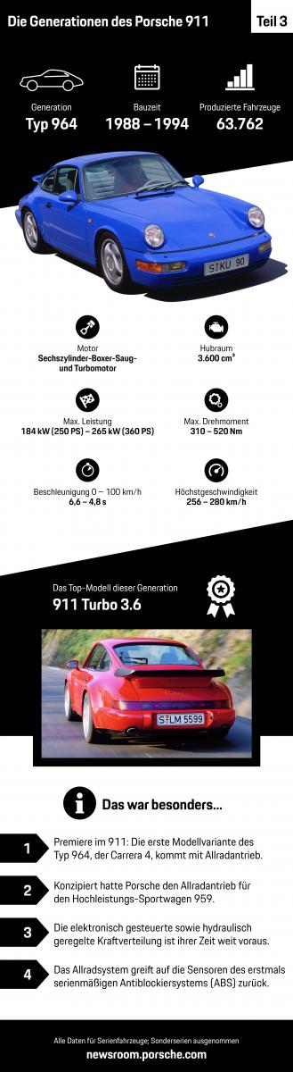 На вершине модельного ряда 911 серии 964 были варианты с турбонаддувом. Оснащенный 3,3-литровым двигателем от своего предшественника, 911 Turbo теперь развивал 320 л.с., а 911 Turbo S выдавал внушительную мощность 381 л.с. Начало 1993 года ознаменовалось переходом на новый 3,6-литровый двигатель с 360 л.с. С октября 1993 года эстафету принимает новый преемник – эволюция легендарного спортивного автомобиля продолжается. Всего за период с 1988 по 1994 год было выпущено 63 762 автомобиля серии 964.