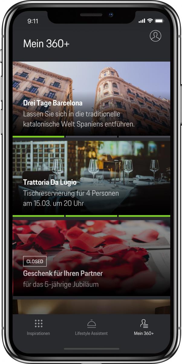 Porsche 360+ также содержит множество предложений в самых разных категориях. Например, услуги по уходу за автомобилем, такие как премиум мойка. Цифровой ассистент также способен помочь с выбором ресторана или путешествия, предлагая клиенту вручную отобранные варианты. Эксклюзивные преимущества также включают в себя доступ в избранные деловые клубы для клиентов Porsche 360+ – например, с возможностью использовать конференц-залы в аэропортах. Приложение Porsche 360+ доступно в App Store для смартфонов на операционной системе iOS.