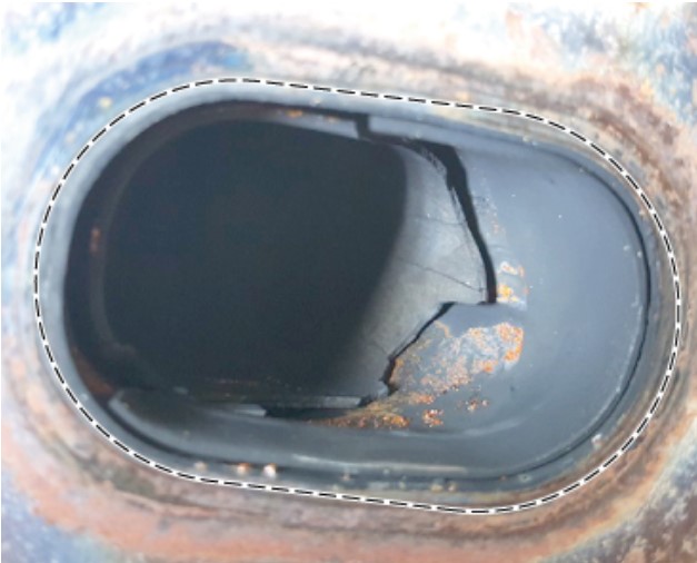 Отсоединившиеся элементы треснувшей внутренней полусферы коллектора вызывают повреждение турбонагнетателя.