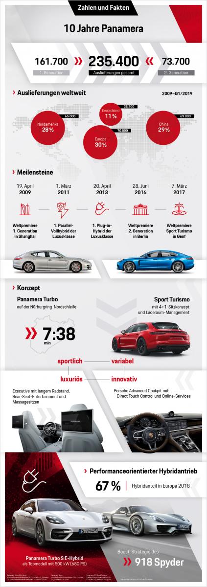В 2011 году компания Porsche вместе с Panamera определила свой дальнейший путь в области электромобильности. Panamera S Hybrid является по сегодняшний день самым экономичным Porsche за всю историю компании, несмотря на то, что он стал первым в классе «люкс» автомобилем с параллельным гибридным приводом и мощностью 380 л.с. Двумя годами позже появился Panamera S E-Hybrid – первый подключаемый гибрид в сегменте, который обладал мощностью 416 л.с. и запасом хода на электротяге 36 км. Во втором поколении Panamera компания Porsche во всех модельных вариантах сделала ставку на концепцию E-Performance: позаимствованная у суперкара 918 Spyder функция усиления (Boost) позволяет добиться спортивных ходовых качеств при одновременно высокой экономичности – как у 462-сильного Panamera 4 E-Hybrid, так и у топ-модели Panamera Turbo S E-Hybrid с суммарной мощностью 680 л.с.