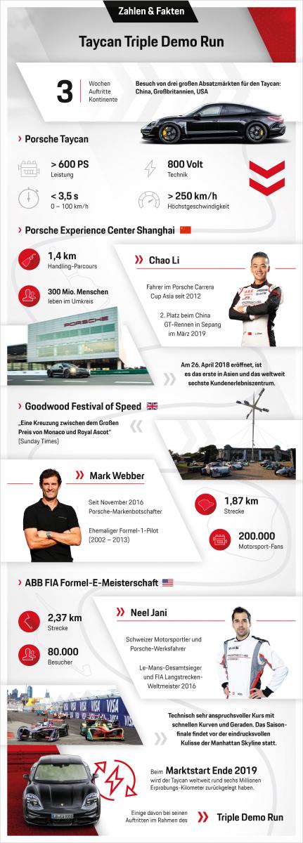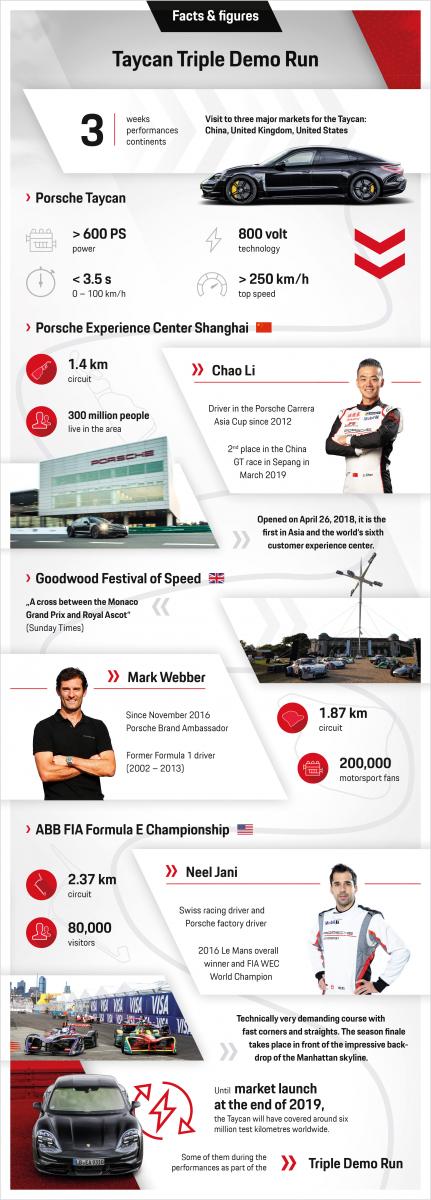 На прошлой неделе за руль Taycan сел китайский пилот Ли Чао. Участник азиатского кубка Porsche Carrera проехал на прототипе несколько тестовых кругов по сложной трассе центра Porsche Experience в Шанхае. Заводской пилот Porsche Нил Яни сядет за руль Taycan в ходе заключительного этапа сезона чемпионата Формулы E в Нью-Йорке 13 и 14 июля 2019 года. В результате Taycan побывает в Китае, Великобритании и США – важнейших рынках для первого в истории полностью электрического спорткара Porsche.
