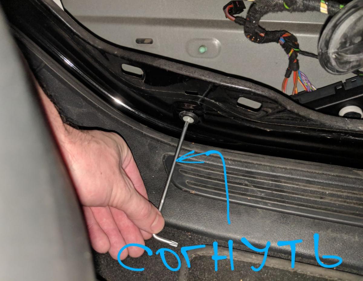 Дверную обшивку можно снять не открывая дверь, где находятся болты и как их выкрутить описывать не буду - инфы полно. Основная проблема выкрутить нижний саморез (возле красного фонарика). Я маялся L-образным ключиком торкс, открутил минут за 10. Проблема в том, что саморез этот вкручивается немного под углом и пластик порога не дает вставить ключ (см картинку). Приходится сильно вдавливать край ключа к порогу, к полу. Сделав оборота 4 и сняв фонарик, зацепившись пальцами смог вырвать обшивку с саморезом из его пластиковой закладной. Только потом уже сообразил, что надо было немного ключик согнуть и было бы проще (см картинку). Срывать с пистонов лучше всего маленькой монтировочкой для пистонов в районе центральной стойки. Пластик обшивки довольно хороший, даже приложив большое усилие ничего не сломалось. Обшивка снялась, хотя и надо было повозиться, бо в моем случае обшивка была еще со шторкой (ее надо выдвинуть руками и тогда снимать обшивку)