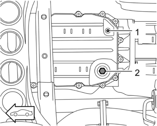 6 Выкрутить резьбовую пробку контрольного отверстия уровня масла -2-. Момент затяжки 70 Nm