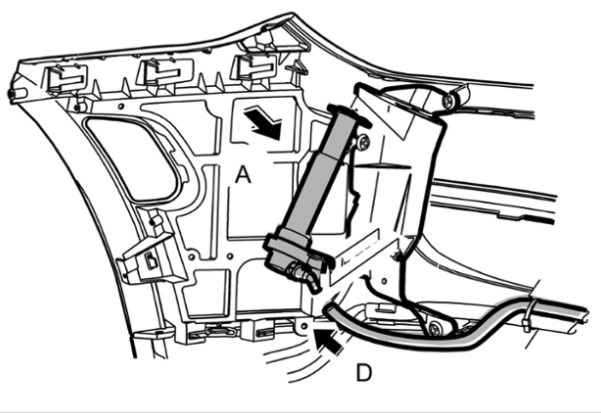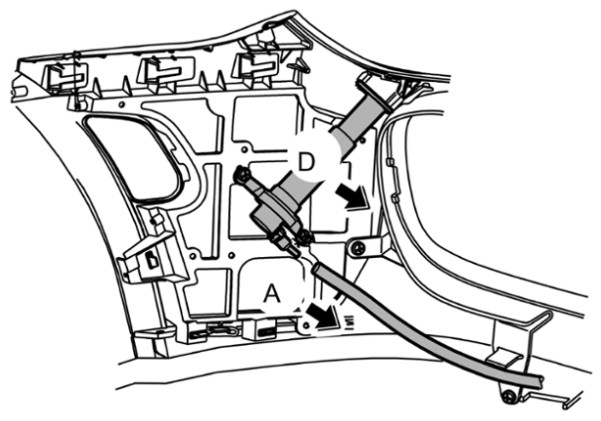 4 Соединить быстроразъемное соединение трубки омывателя на подъемном цилиндре -стрелка D-.