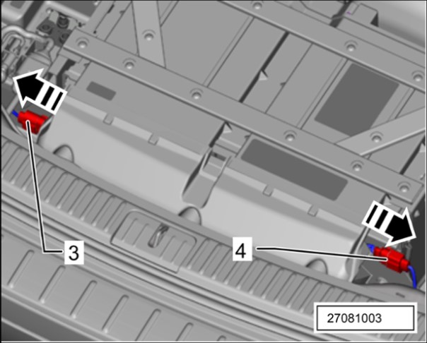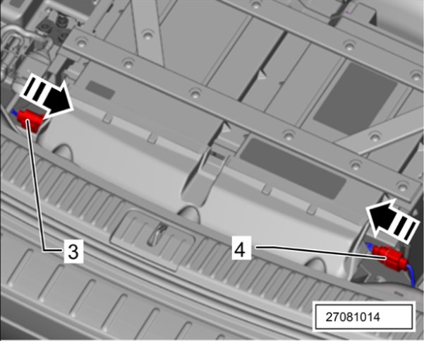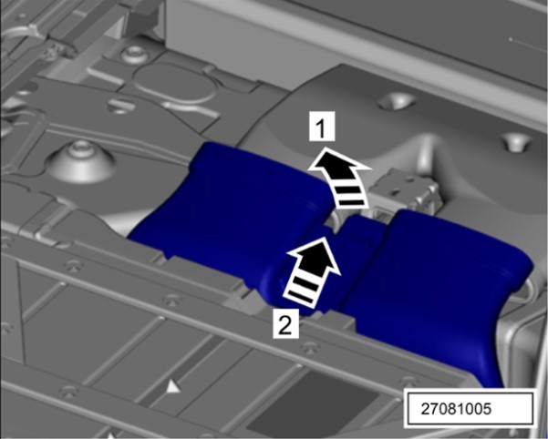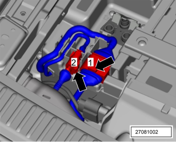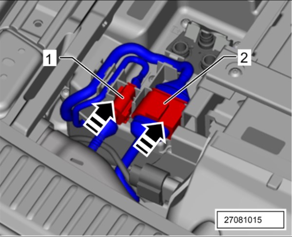 9 Вставить оба электрических разъема -1, 2- для системы управления АКБ до ощутимой фиксации разъемов.