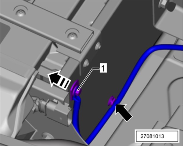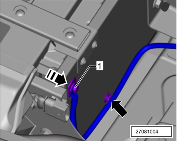 7 Закрепить провод массы на высоковольтной АКБ с помощью кабельного хомута -стрелка-.