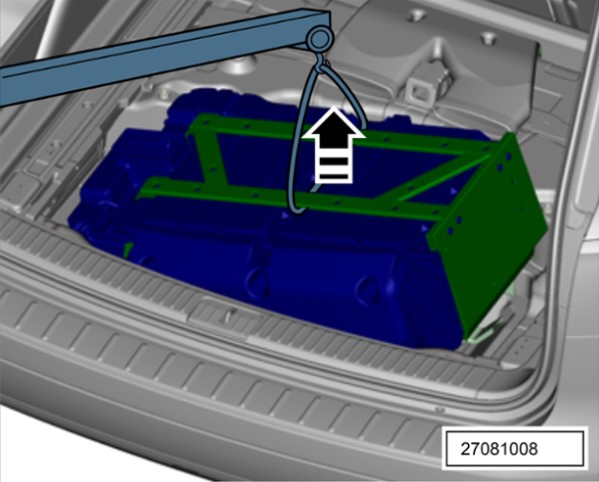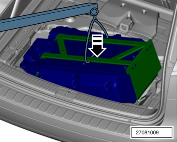 1 Расположить высоковольтную АКБ в автомобиле посередине с помощью короткого ремня и Сервисный кран.