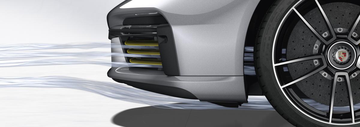 Активный передний спойлер 911 Turbo был значительно усовершенствован. По сравнению с предшественником его рабочая поверхность была увеличена. Процессом выдвижения и возврата в исходное положение можно управлять быстрее и при меньшем давлении. Исполнительные элементы позволяют по отдельности надувать три сегмента. Оба боковых исполнительных элемента всегда работают синхронно. Передний спойлер изготовлен из эластичного полимера (эластомер) и может скручиваться так, что средний сегмент при выдвинутых сегментах может оставаться в убранном положении или же тоже быть выдвинутым. Имеется несколько возможностей регулировки: