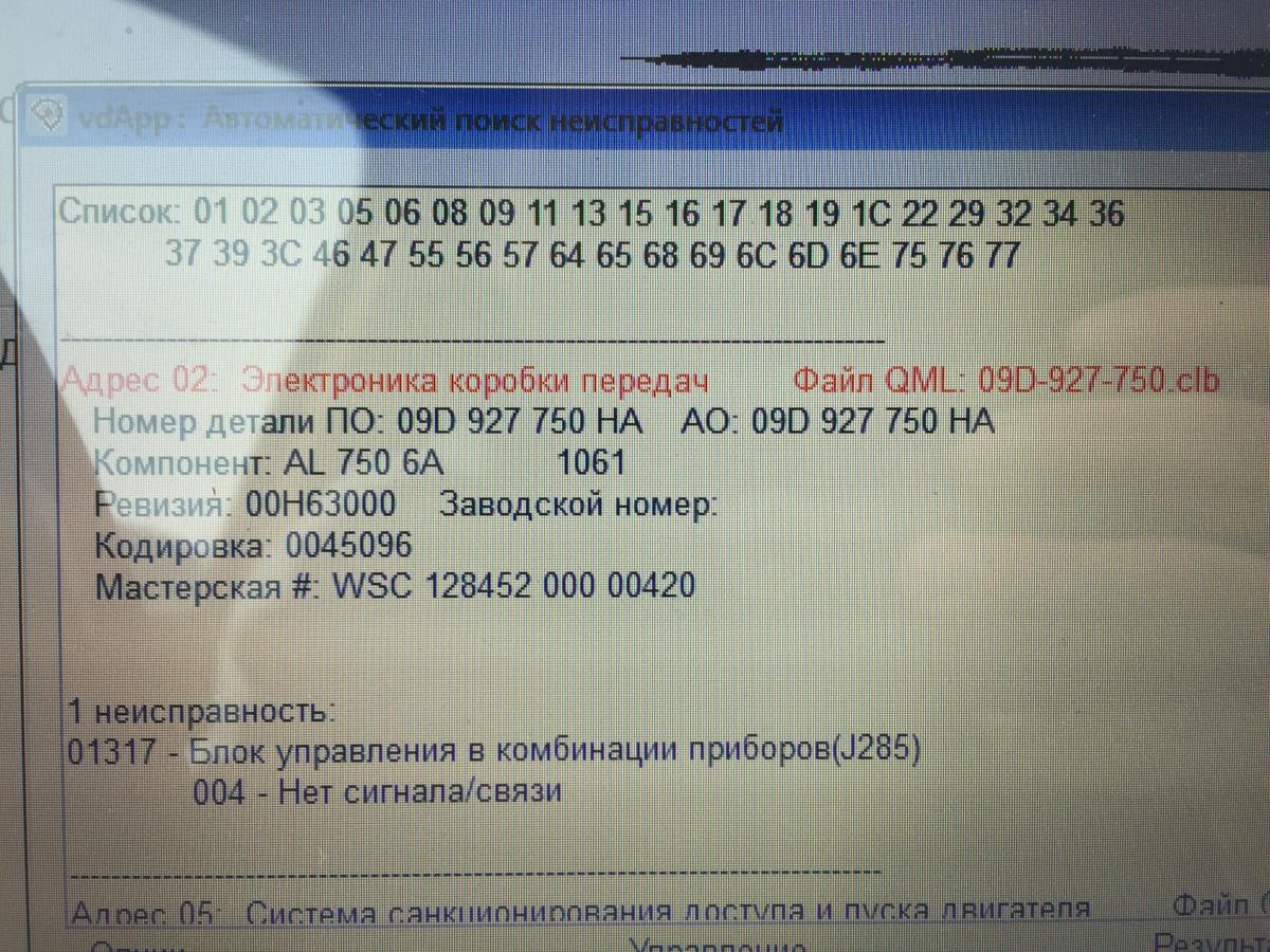Здравствуйте дорогие клубни!! Машина стояла 3 недели, акум сел, после того как завел выскочил чек, езжу уже 4 день, чек не гаснет. Диагностика показала ошибку 01317-блок управления в комбинации приборов(j285), 004-нет сигнала, Адрес 02:Электроника коробки передач. Заметил , что перестал работать типтроник ,но только на руле, в сотальном без изменений ! Помогите советом друзья! ? 957S