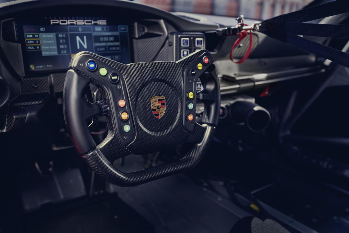 Значительное внимание разработчики уделили эргономике рабочего места пилота. Новое гоночное сиденье имеет не только регулировку по углу наклона, но двухпозиционную регулировку по высоте. Вместе с регулировкой рулевого колеса по двум направлениям это позволяет водителям любой комплекции подобрать для себя оптимальное положение. Дополнительные возможности индивидуальной регулировки предлагает обивка разной толщины. Новое углепластиковое спортивное многофункциональное рулевое колесо, напоминающее штурвал самолета, является производным вариантом рулевого колеса 911 GT3 R. Его подсвечиваемые кнопки по желанию водителей получили новое расположение. Расположенная справа мембранная панель (Rubber Switch Panel, RSP) с 10 большими кнопками аналогична той, что была использована для Porsche 919 Hybrid. Этими кнопками, которые служат для управления основными функциями, например, светом или вентиляцией, а также сменой настроек при переходе с обычных на дождевые шины, удобно пользоваться даже в самых жарких условиях гонок. Важное усовершенствование затронуло настройки баланса тормозной системы, который интуитивно регулируется поворотом колесика на правой стороне RSP в направлении движения или против него – в зависимости от того, какую долю тормозного усилия следует направить на переднюю ось.