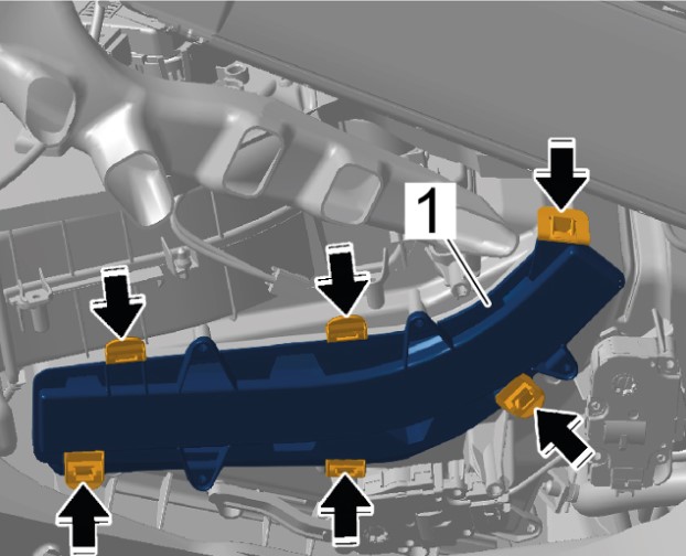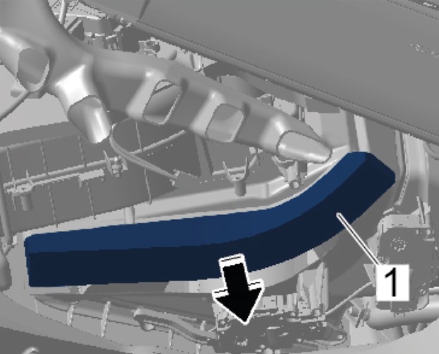 2 Отсоедините накладку сажевого фильтра -1- и снимите ее -стрелки-.